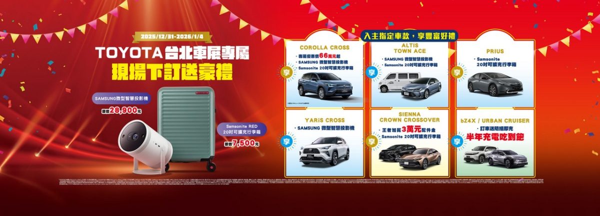 此外,TOYOTA亦推出台北車展專屬「現場下訂送豪禮」註1限定活動,入主指定車款贈送SAMSUNG 第2代The Freestyle 微型智慧投影機(原價28,900元) 或 Samsonite 20吋可擴充行李箱(原價 7,500 元),好禮數量有限,送完為止。同時,於車展現場下訂 SIENNA 與 CROWN CROSSOVER,可再享「王者加冕」3 萬元尊榮配件金;下訂純電車款 bZ4X 與 Urban Cruiser則享專屬「隨插即充」半年充電吃到飽方案,為電動車主帶來更無憂、更便利的用車體驗,陪伴顧客輕鬆邁向智慧電能新生活。TOYOTA感謝消費者一路以來的熱烈支持,讓每位入主 TOYOTA 的顧客不僅擁有卓越好車,更能享受超越期待的精采移動旅程。