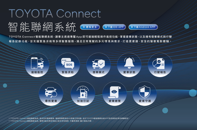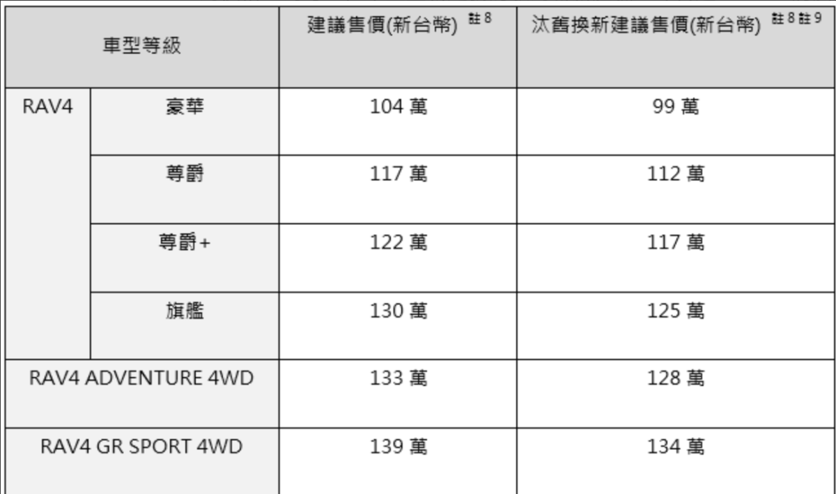 註5:「同級最佳」係指於全台現有非豪華品牌非純電 SUV 中,依據歐盟1999/100/EC指令及後續修正指令之測試標準下之平均油耗數據比較結果。「油耗表現24km/l」為RAV4 ADVENTURE4WD及RAV4 GR SPORT4WD以外之版本實驗室測試值,實際道路行駛時,因受天候、路況、載重、使用空調系統、駕駛習慣及車輛維護保養等因素影響,其實際值可能與測試值有所差異。詳情請參閱經濟部能源署網站。
