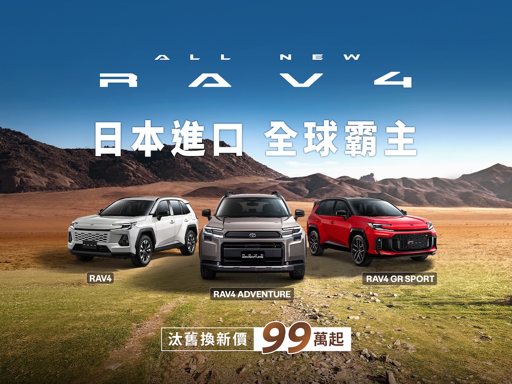 SUV經典傳奇-RAV4於1994年問世,上市後即以其優異的品質與性能,深受國內外消費者喜愛,在全世界已銷售超過1,500萬輛,亦是全球銷售霸主註1。而RAV4自1997年導入台灣後,深受台灣市場好評,不僅18年蟬聯進口車銷售冠軍,累計在台灣銷售也超過32萬輛註2。自2025年12月26日開放預接以來,市場詢問熱度瞬間引爆,累計訂單突破5,000張大關,其中 RAV4 ADVENTURE、RAV4 GR SPORT 等個性化車型佔比更高達40%,反映出新世代車主不再滿足於單一用途,更渴望透過座駕展現自我風格的質感生活態度。