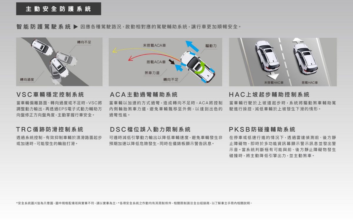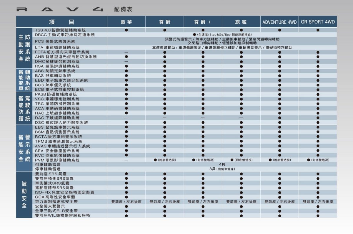 ▲在主/被動安全配備方面,第六代RAV4全車系標配TSS 4.0智動駕駛輔助系統,包含DRCC主動式車距維持定速系統、PCS預警式防護系統(經性能提升)、LTA車道循跡輔助系統(經性能提升)、AHB智慧型遠光燈自動切換系統、RSA速限辨識輔助系統、BAS煞車輔助系統、BOS煞車優先系統、VSC車輛穩定控制系統、ACA主動過彎輔助系統、DSC檔位誤入動力限制系統、7具SRS安全輔助氣囊、ISO-FIX兒童安全座椅固定裝置等許多安全配備外,還新增了RCTA後方車側警示系統、PKSB防碰撞輔助系統。而在尊爵版以上更新增了15km/h以下會偵測左右側來車和提醒的FCTA前方橫向來車警示系統,會偵測駕駛臉部位置方向以及眼睛開與閉並進行提醒的DMC駕駛疲勞監測系統統。除此之外,TSS 4.0的前鏡頭也提升了更遠的偵測距離,前方雷達水平視野角度擴大1.5倍,偵測距離提升1.7倍,能夠函蓋更寛更遠的偵測距離。還有經強化附底盤透視的PVM 環景影像輔助系統。