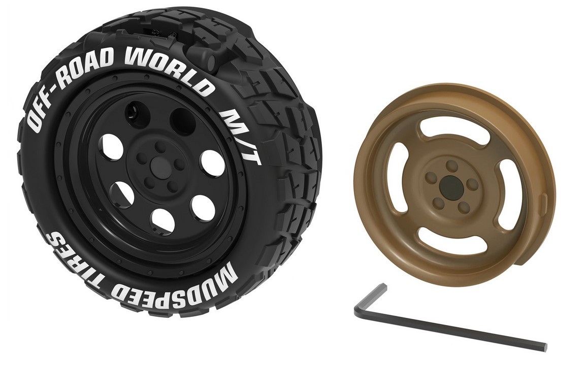 接著介紹同樣出自EXEA的Tire Drink Holder(E135JM),這款置杯架專為Jimny系列設計,可安裝在空調出風口上,並附六角扳手便於固定。其最大特色在於外觀設計,以越野輪胎為靈感,整體造型兼具趣味與個性。當不放置飲料時,可折疊收納,白色字母標示的輪胎造型更添視覺效果。此外,置杯架的輪圈部分提供兩種可替換的設計,使用者可依喜好更換。功能性方面也相當優秀,下方杯座可穩固支撐飲料,上方環圈可調整角度以符合不同杯型大小,兼具美觀與實用。