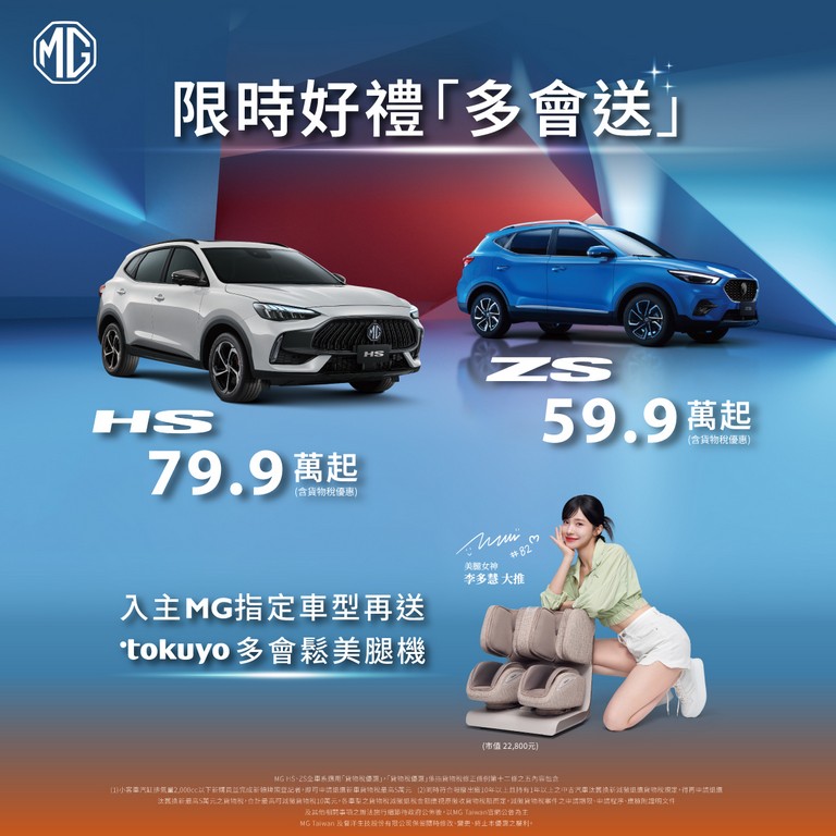 1. 各車款建議售價及購車優惠資訊詳情依MG Taiwan官網線上訂車之公告為準。 2. 規格配備以台灣實際銷售車款為準,MG Taiwan保留規格配備變更或停用之權利。 3. MG Taiwan保有最終修改、變更、活動解釋及取消本活動之權利,更多詳情請向MG Taiwan授權經銷商洽詢。 4. 優惠貸款方案均限指定合作對象並保有審核之權利。 5. MG HS、ZS、G50 PLUS 全車系適用貨物稅修正條例第十二條之五內容,包含(1)小客車汽缸排氣量2,000cc以下新購買並完成新領牌照登記者,即可申請退還新車貨物稅最高5萬元 (2)同時符合報廢出廠10年以上且持有1年以上之中古車汽車汰舊換新減徵退還貨物稅規定,得再申請退還舊換新最高5萬元之貨物稅,合計最高可減徵貨物稅10萬元 6. (1) tokuyo-多會鬆 踝旋美腿機,型號:TF-660,顏色 : 奶茶棕、藍貓灰,隨機出貨不指定。(2) Panasonic-溫感氣動足腿按摩靴,型號:EW-RA190,顏色 : 玫瑰櫻、柔霧灰,隨機出貨不指定。 (3) 僅提供至MG展示中心領取,不提供指定地點配送。(4) 以實物為準,不接受退費或更換等值商品。保固說明、限制範圍及使用辦法詳見產品說明書。(5) 產品由督洋生技提供原廠保固一年,商品諮詢或產品維修由督洋生技提供免費客服專線0800-369-963,週一~週五09:00–12:00&13:00–18:00(國定例假日除外)。 |