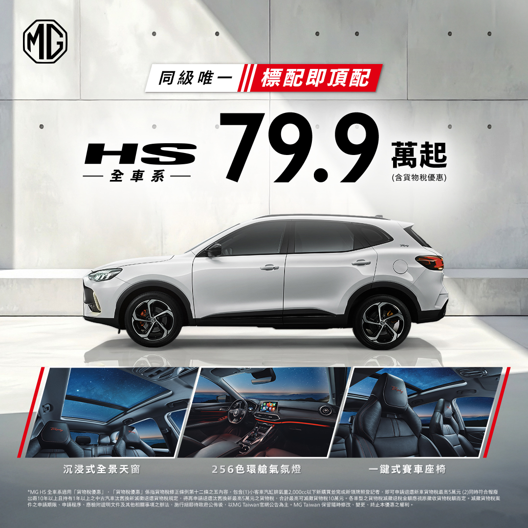 MG Taiwan同步祭出11月旗下多款熱銷車型的限定購車優惠,當家旗艦休旅HS1.5T搭配貨物稅新購減徵與舊換新補助後,最低79.9萬元即可入主;都會暢銷小休旅ZS 1.5L心動版享補助後最低59.9萬元即可入手;而最親民正七人座MPV車款G50 PLUS,搭配雙重補助優惠後最低僅需98.5萬元即可輕鬆擁有,三大車系同步推出限時購車禮遇,不論是注重動感駕馭、靈活都會通勤,或重視家庭乘載需求的車主,都能在MG找到最契合生活風格的理想座駕。