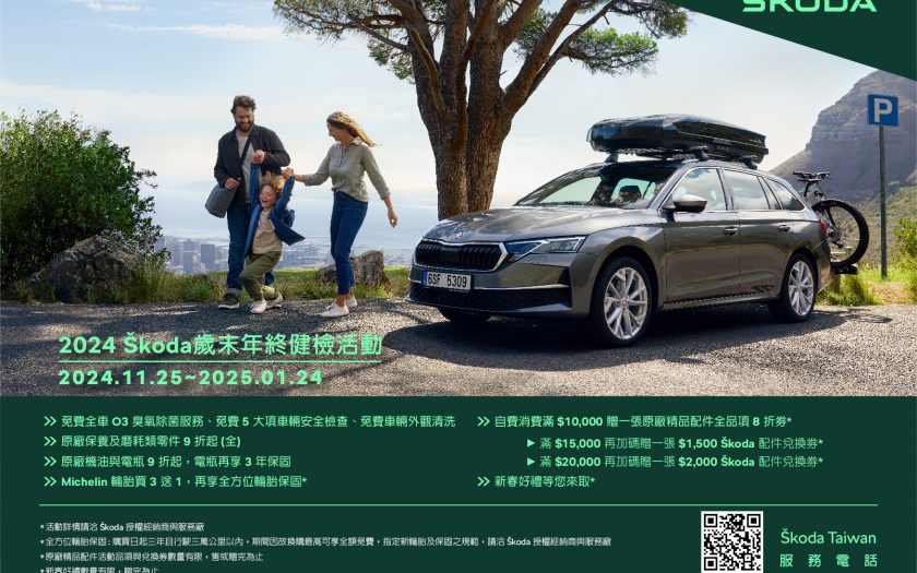 Škoda 2024 歲末年終健檢活動,提供五大項檢查項目,包括:引擎、避震器、剎車、變速箱及電瓶。在健檢期間,Škoda 不僅針對原廠保養與耗損零件全面提供 9 折優惠,更推出換購新電瓶專屬方案,享 3 年電瓶保固。此外,凡購買 Michelin 輪胎,即可享買三送一優惠,並附 3 年或 3 萬公里輪胎保固服務。