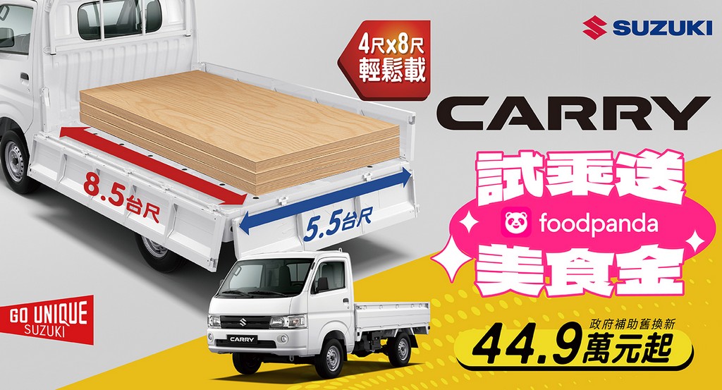 專為職人打造、在地頭家首選的 SUZUKI CARRY,以超實用的 8.5 x 5.5 尺大貨台設計,讓業界常見的 4×8 尺板材能「剛剛好」平整上車、不必傾斜、不怕損傷,成為木工師傅與行動商家的運輸首選。