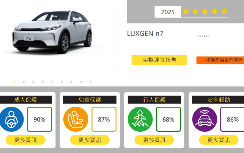 臺灣新車安全評等制度(TNCAP,Taiwan New Car Assessment Program)今29日公布測試結果。由裕隆汽車製造並送測之LUXGEN n⁷ LR …