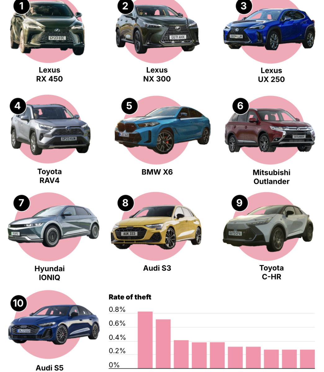 根據《每日郵報》對英國車輛牌照管理局(DVLA)數據的分析,他們歸納出了英國道路上被盜最多的10種車型,沒有意外,Toyota集團是最大苦主。10大易被偷的車款,前三名都是Lexus,另外還有兩台Toyota。